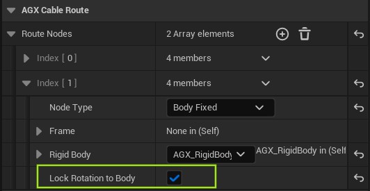 These nodes define the initial route of the cable at BeginPlay. After initialization, the route node list is no longer used or updated, and instead AGX Dynamics takes over and simulates the dynamic behavior of the Cable.