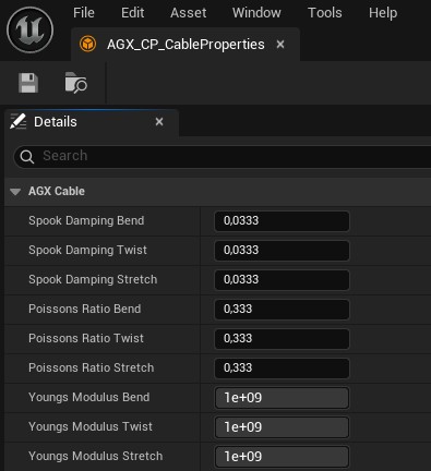 If no Cable Properties Asset is assigned to a Cable Component, the AGX Dynamics default values will be used during simulation.