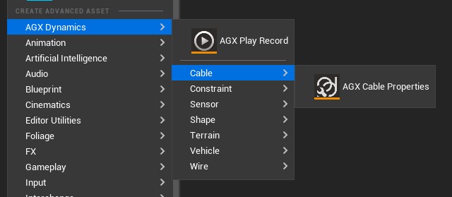 To create a Cable Properties Asset, right-click on the Content Browser and select the appropriate Asset type according to the image below: