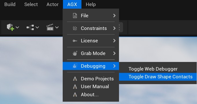 To enable the Draw Shape Contacts feature, select the Toggle Draw Shape Contacts option from the AGX top menu during Play.