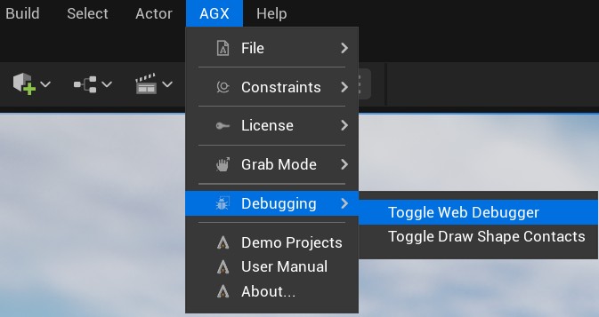 To start the Web Debugger during Play, in the AGX top menu, select the Toggle Web Debugger option.